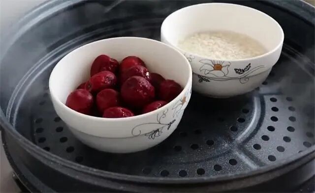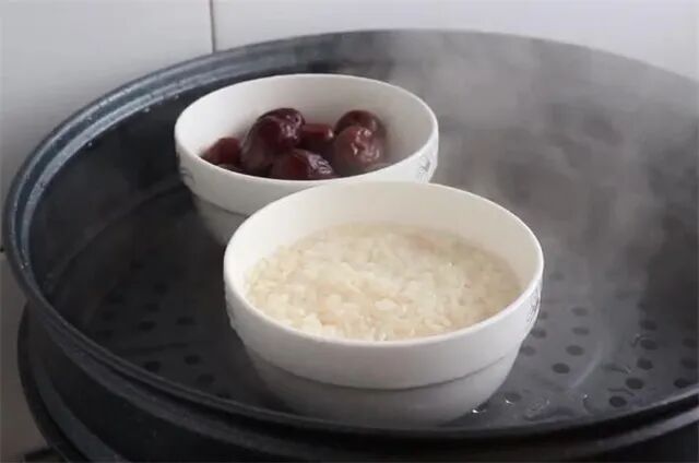 2.糯米碗里加入少量的水,水的量刚好淹住糯米就行,然后把糯米和红枣放蒸锅上蒸半个小时。