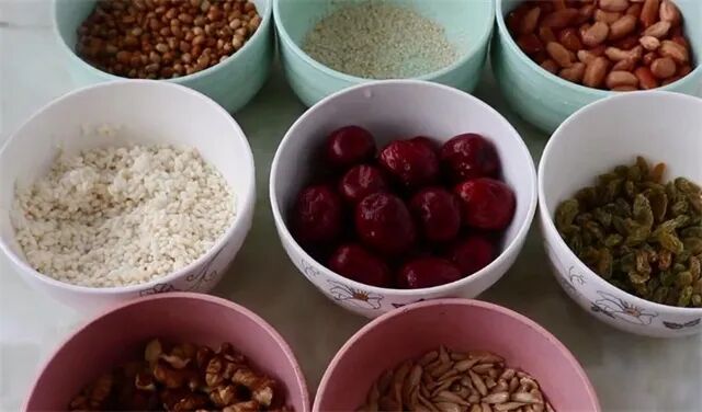核桃仁、瓜子仁、糯米、红枣、葡萄干、豇豆,白芝麻、花生、清水、碱面、白糖、水淀粉
