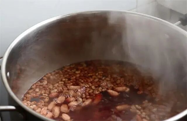3.重新换个锅烧水,把豇豆倒进去,煮的时候加一小勺碱面,加碱面可以使熬出来的粥颜色红亮,这个过程就叫做"兢"红豆汤,兢豆子时,要用中小火,不能用大火,锅里汤汁煮开后,加入花生仁和葡萄干,煮的过程中要不断地给锅里加凉水来控制汤的温度,千万不能把汤煮沸了,不然豆子经过高温煮沸后容易破,如果豆子煮破了,兢的红豆汤变得黏糊糊的,颜色就不好看了,水要一直保持似开非开的状态,慢慢地兢豆子。
