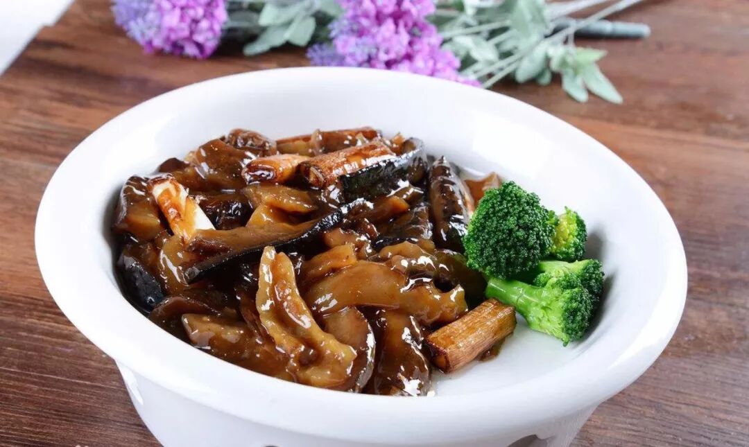 2. 发好的海参水沥干擦拭干水份,大火入同一口葱油锅爆香,喷少许料酒去腥后,加入老抽一大匙,蚝油半大匙,翻炒均匀。加入高汤半饭碗,然后转中小火慢熬,盖锅盖焖煮20分钟后尝试你喜欢的软硬度。