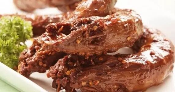 完成汤料调配后,根据产品的加工时间,放入鸭子系列原料,用大火煮制(每加入鸭子系列原料1千克,就加入白酒8克,盐18克,味精、鸡粉、冰糖各10克)。煮好以后,关闭火源,焖3分钟(辣椒、花椒一般用2-3次就更换一次)。煮制的时间,根据原料的质地和产地不同,可能会有所差别,以实际情况为准。将已经加工好的原料,从老汤中捞出,冷却。放入已经冷却的老汤中,冷泡30分钟以上(每千克老汤加入财神蚝油、海鲜酱、排骨酱各10克,焦糖色素5克),捞出就可以了。