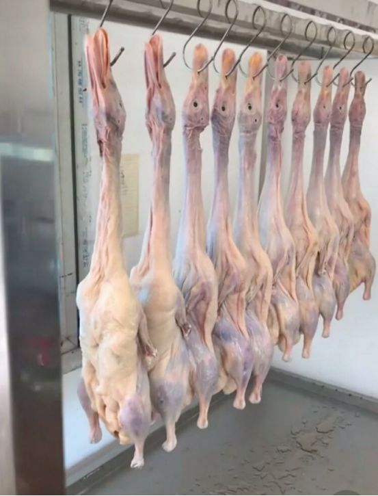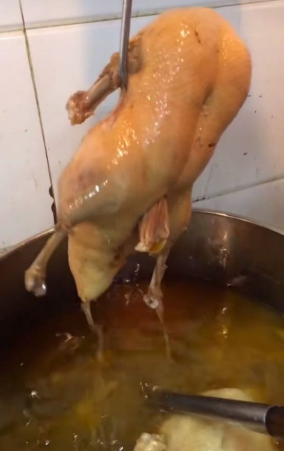 干腌后的鸭子,鸭体中有血水渗出,此时提起鸭子用手指插入鸭子的肛门,使血卤水排出。