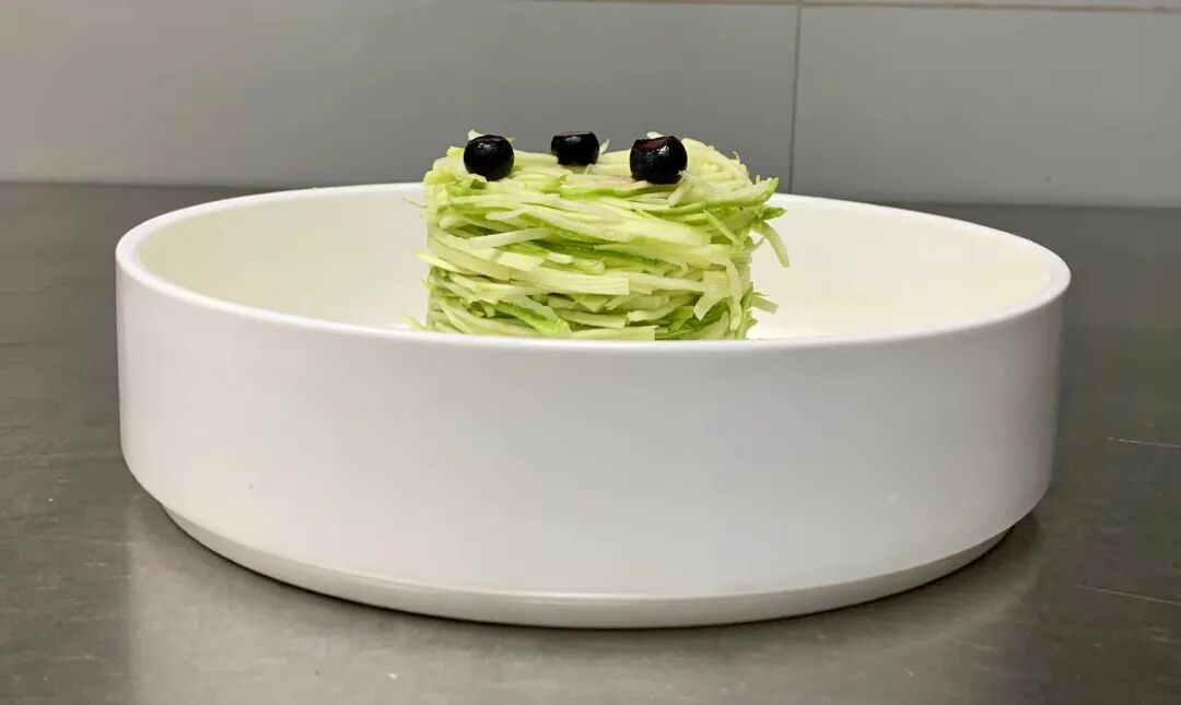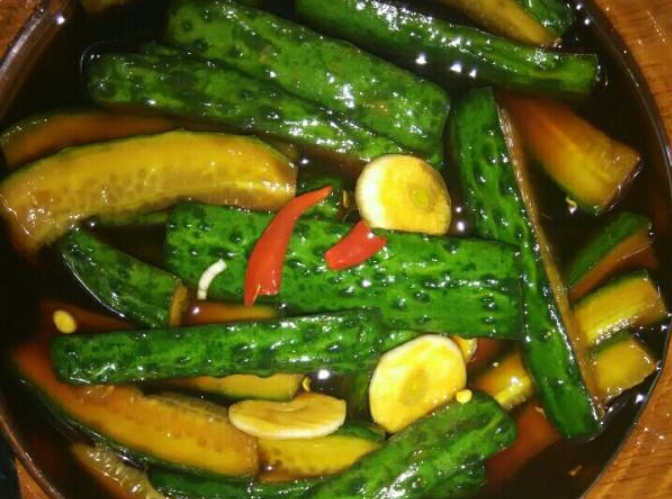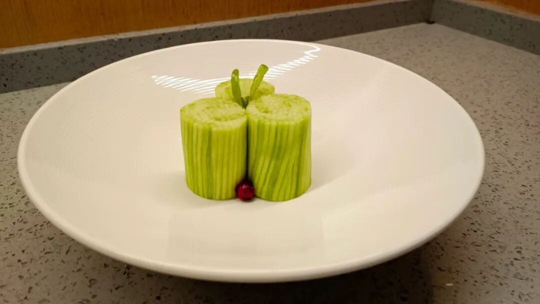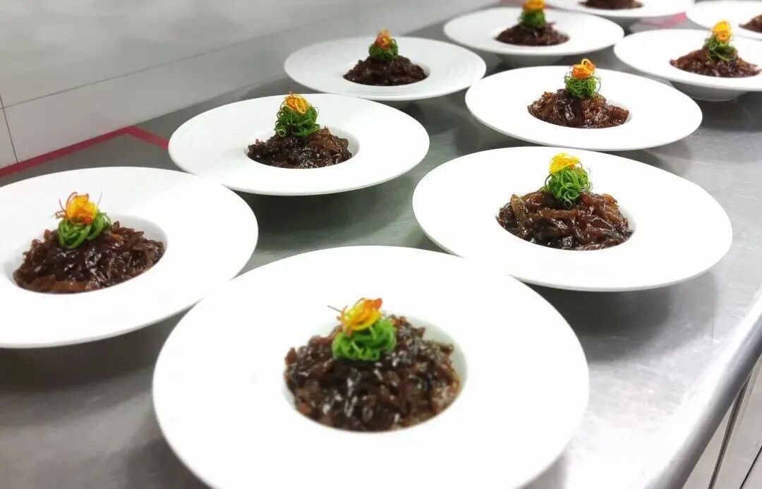 2.走菜时将西葫芦捞出,控干水分入盘中,所有的辅料撒在上面即可。将汁水用调味盅装好,上桌后由服务员将汁当着客人的面倒入西葫芦中拌至均匀即可。