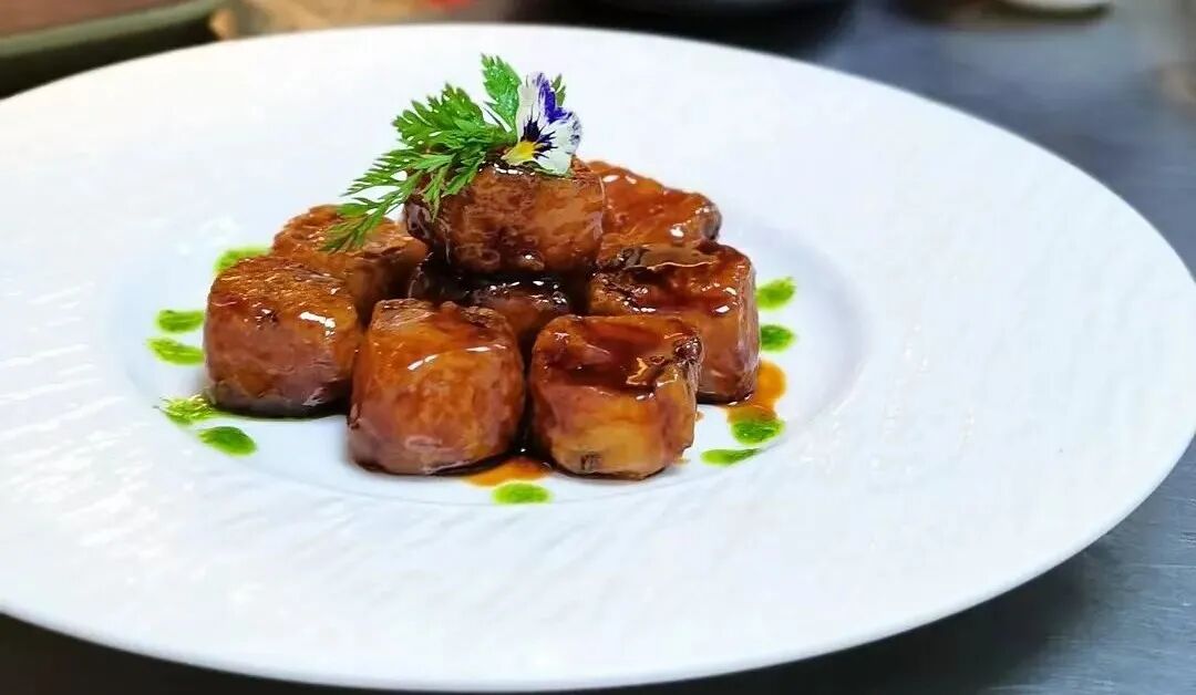 3.将煮好的五花肉入保鲜盒平放,上面放一小号的保鲜盒装满水压制12小时将压制好的五花肉改刀成需要的造型,浇入调好的味汁,放葱花点缀即可。