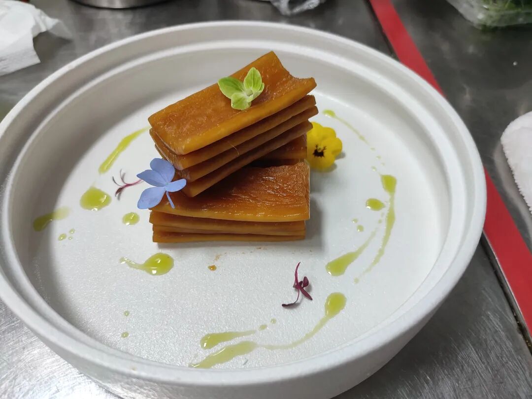 4.炸封油:鸡油4斤、小黄姜(土姜)1斤拍破、大葱带根须1斤拍破,胡萝卜片50克,小火炸干料头水分,呈微微黄,过滤掉渣子,封油就做好了