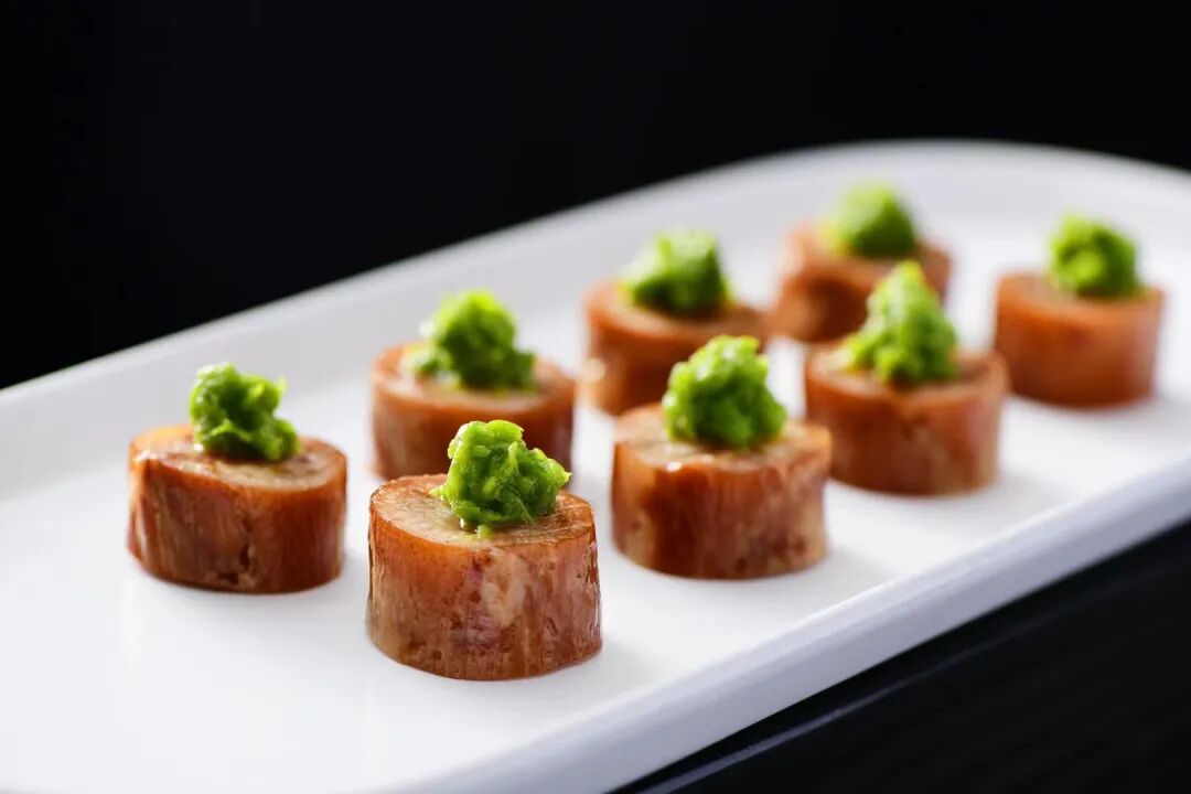 6、也可以摆好淋汁,牛肚牛肉牛舌牛心各20克切长片,折叠摆放
