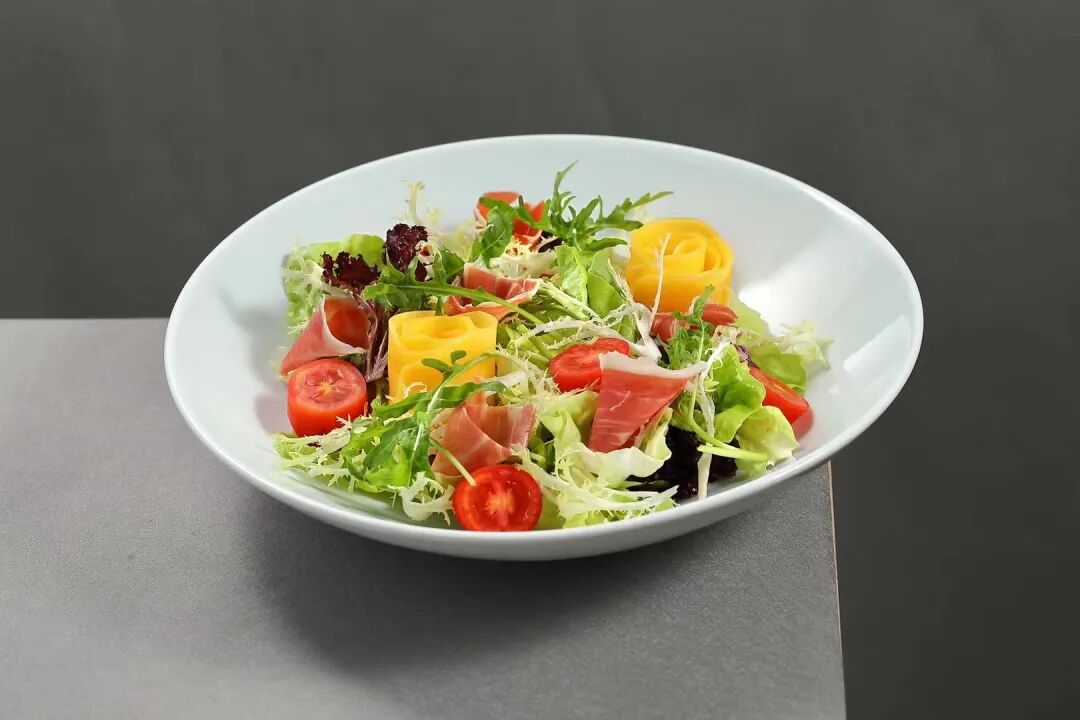 1、球形生菜,橄榄菜、苦菊,手撕成小块,胡萝卜切花刀入冰水泡1小时捞出装盘(水一定要控干),也课配少量的小西红柿切片。