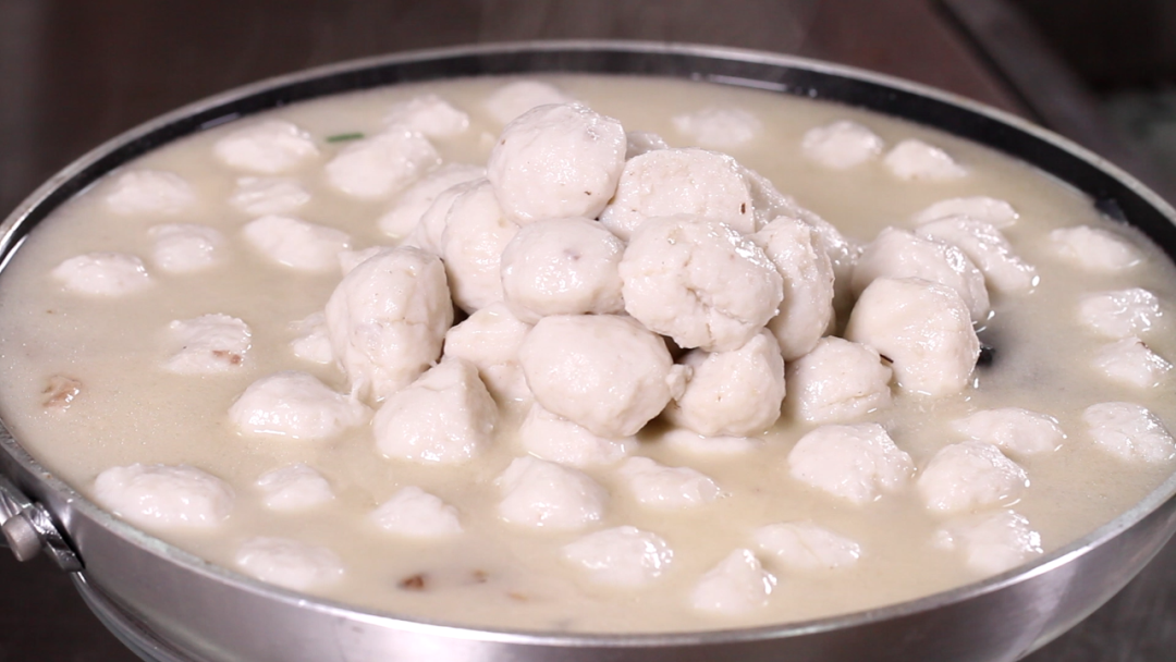12、依次将所有的鱼蓉全部挤入,大火烧开,撇去浮沫
