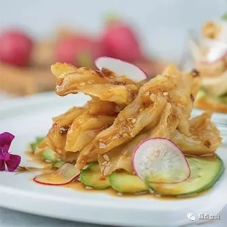 4. 青瓜丝垫底,樱桃萝卜片围边,加入鸭掌,淋上50克麻辣汁即可。