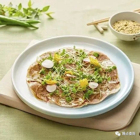 2. 将家乐油淋椒麻酱均匀刷于牛肉片上;
