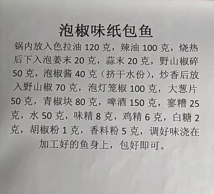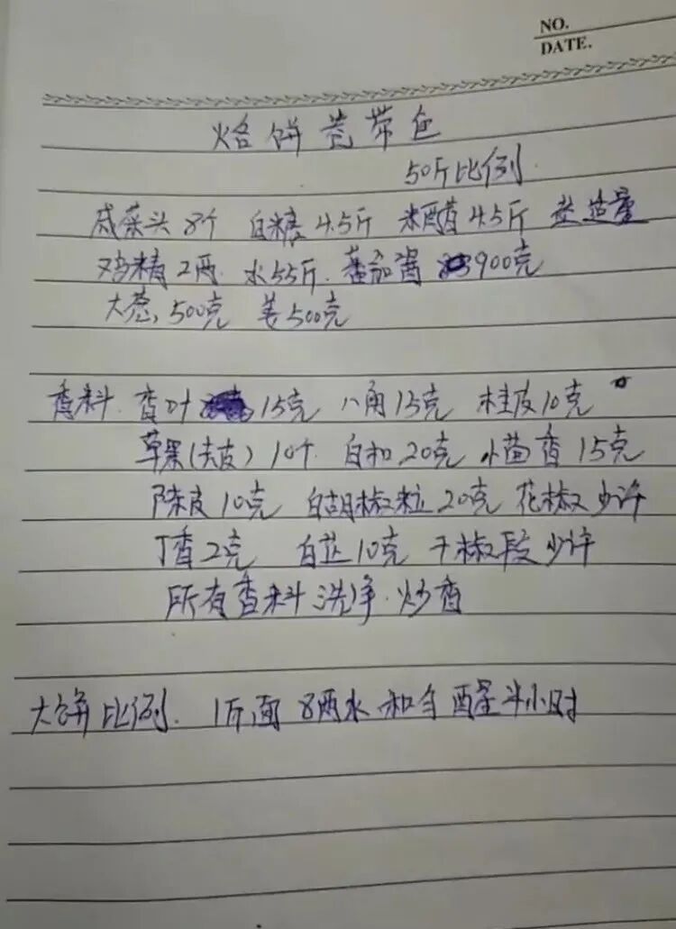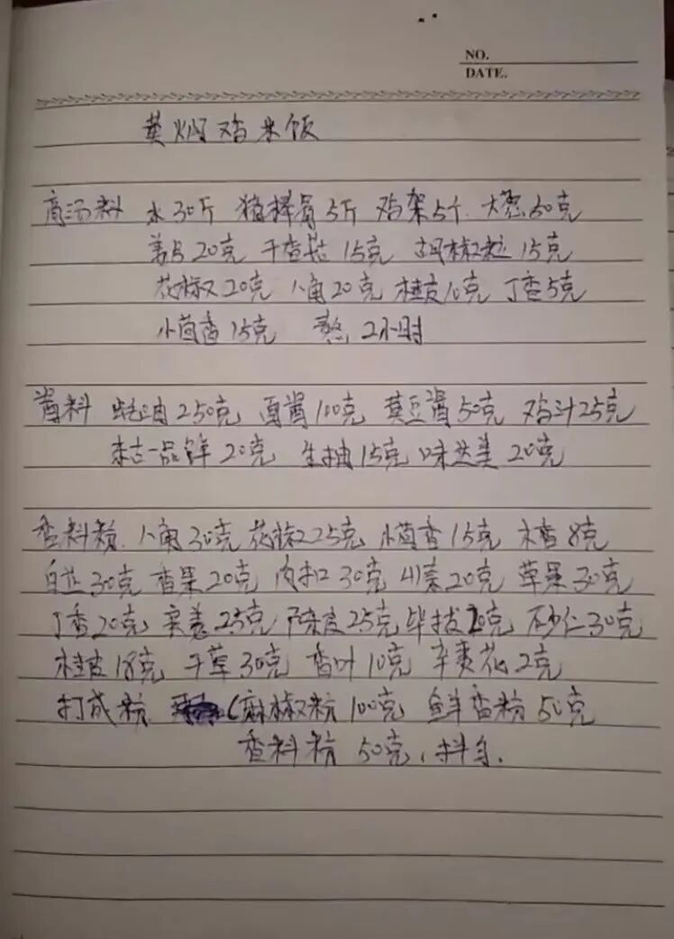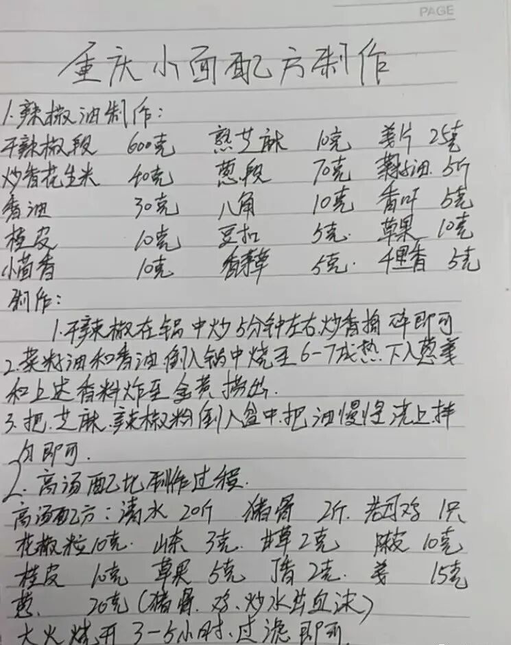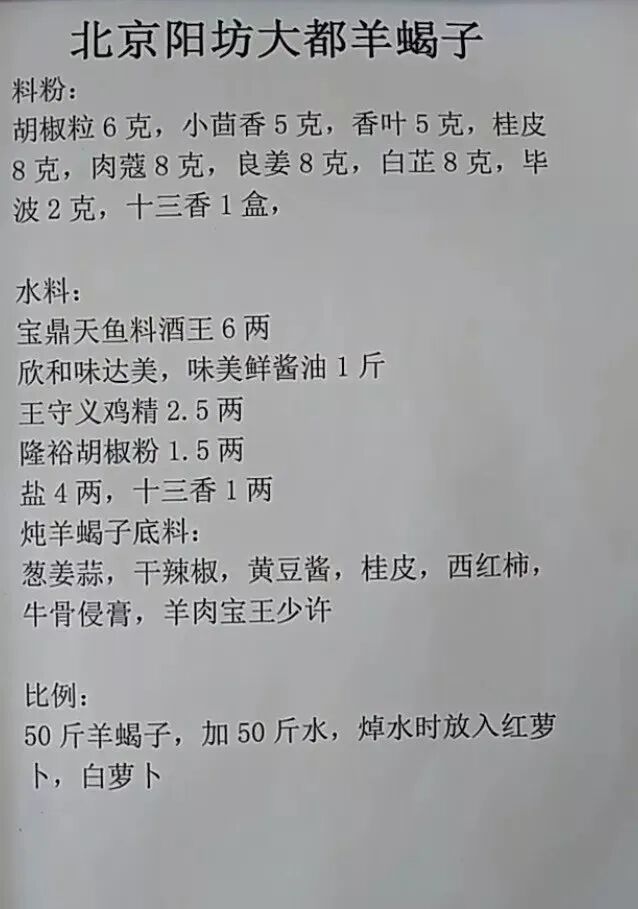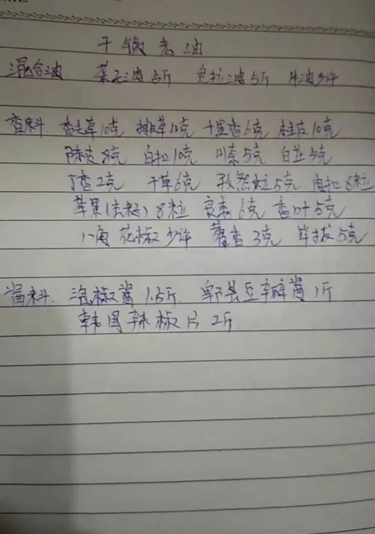 干辣椒、大葱各100克,生姜50克,八角30克,花椒、山奈、桂皮、小茴香、草果、砂仁各10克,丁香、草豆蔻、排草各5克,糖色200克,老抽50克,精盐10克,鲜汤5000克,混合油3000克(蔬菜油、精炼油各1500克)。