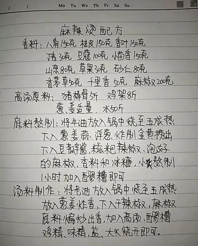 B干川椒600克,八角20克,山奈、小茴香、草果各10克,花椒、豆蔻各15克,砂仁、良姜、桂皮各8克,沙姜、丁香各5克,白芷6克,辛里花(中药材,药店有售)、荜拨、香叶、淮山各3克,木香2克。