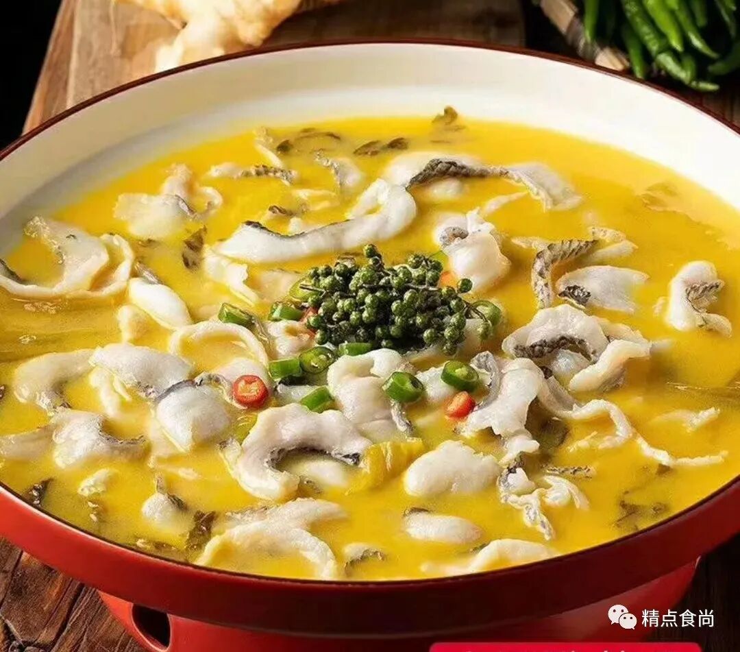 (2)锅入鱼骨汤1000克,调入盐5克、调入青花椒鸡膏10克,味精3克、味特鲜3克,鸡肉精粉5克,下入汆过水的鱼骨段、土豆粉小火煮1分钟,捞起原料垫入碗底,再下入浆好的鱼片500克煮至变色,捞出装盘,原汤勾薄芡、淋鸡油起锅倒人碗中。