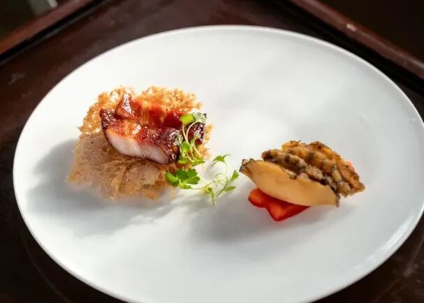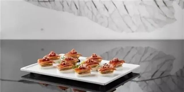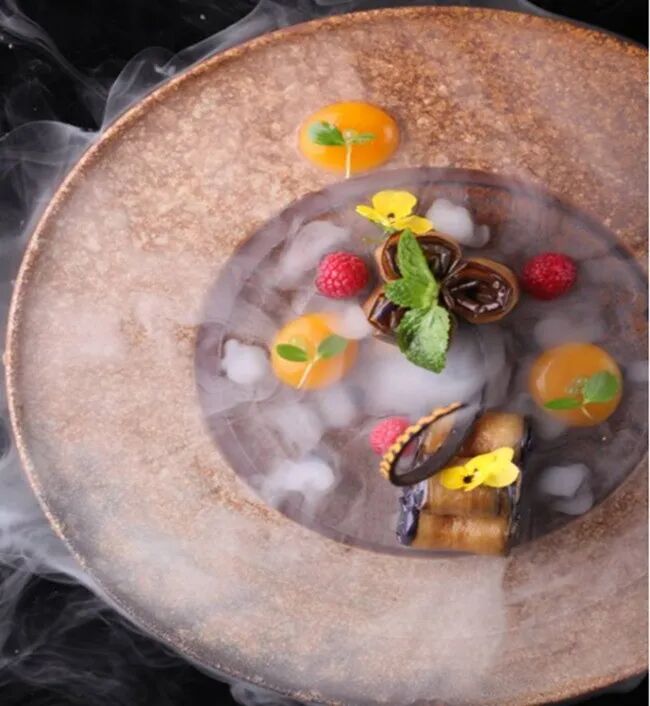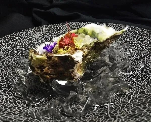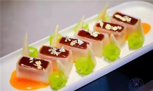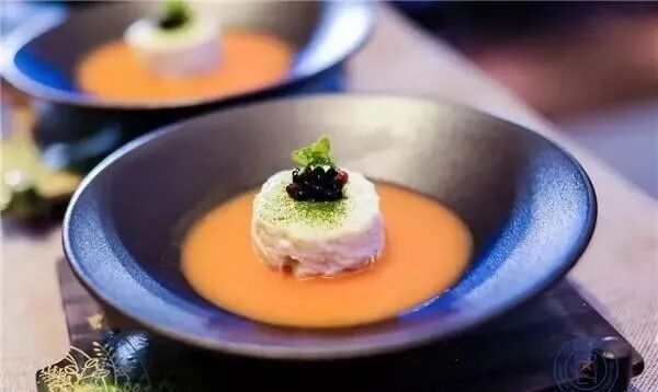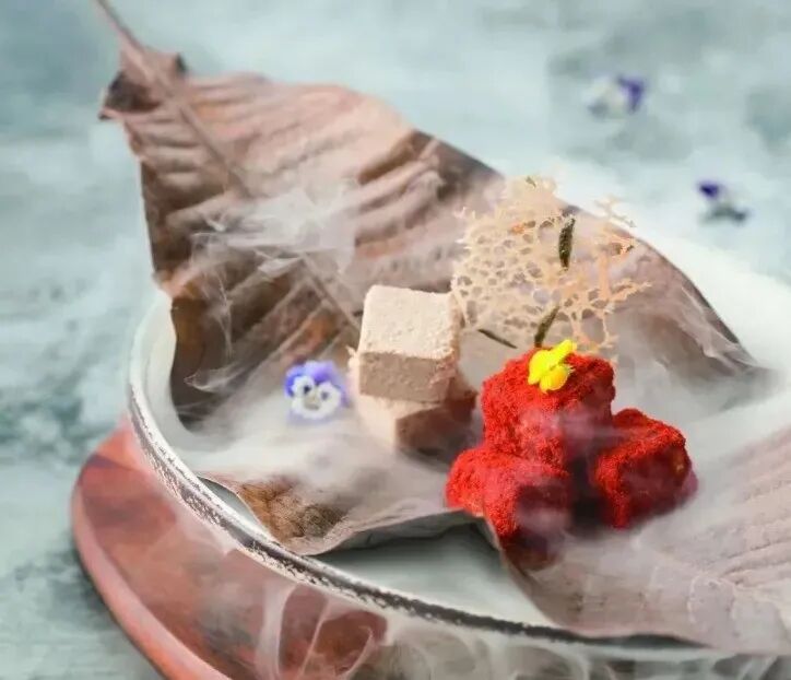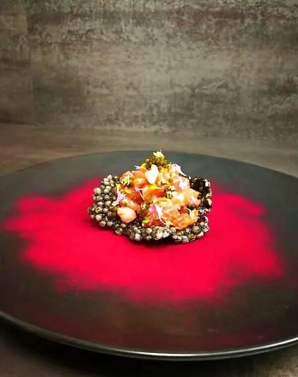 特点:此菜采用新鲜的金枪鱼和甜虾,甜根粉和黑色的搭配初突出了亮丽的颜色,在喷上可食用柠檬味喷雾,口感更是爆棚。