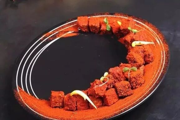 这道牛肉经醪糟腌、油卤煮、宽油炸、汁水泡四步制成,口感油润、干香;表面撒了一层红甜椒粉,颜色艳丽、甜香微辣,而内部的肉块却是怪味的,十分别致。