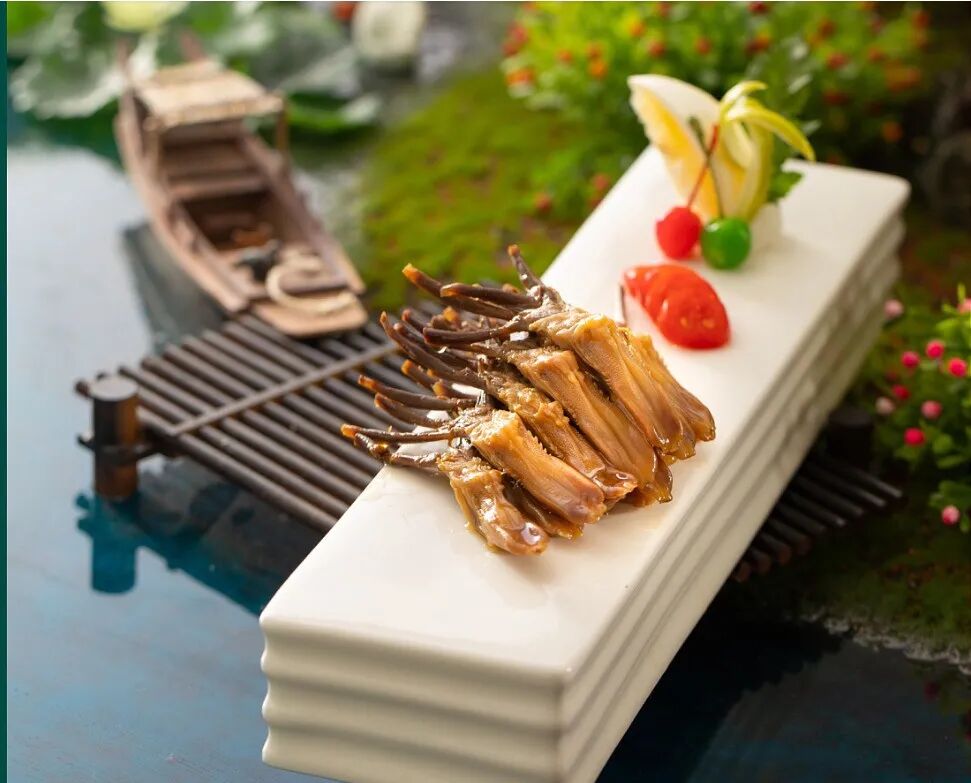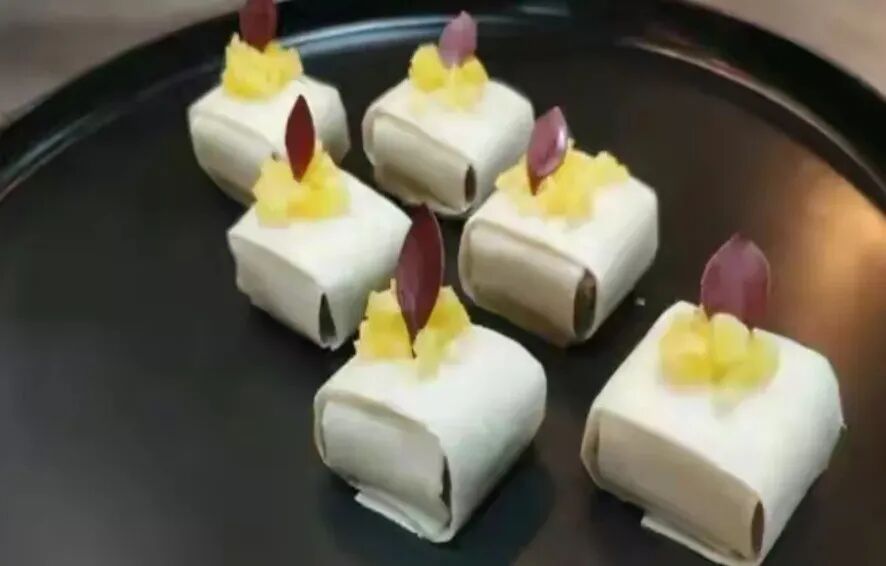 3.鸭饼切成长条,将松板肉裹紧实装盘,放上菠萝粒即可