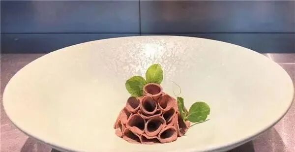 取一个大圆盘,在盘中倒扣入一只码斗,沿着碗边摆入牛肉块200克,在表面厚厚地撒上一层红甜椒粉,取下码斗,点缀豆苗、菊花瓣即可走菜。