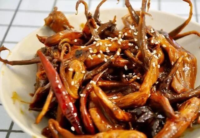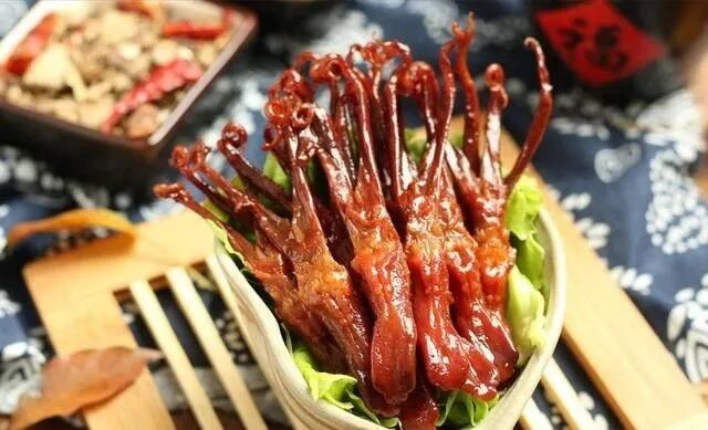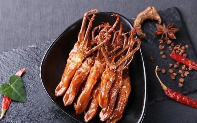 应选新鲜、无异味,舌体肥厚的鸭舌为佳。卤鸭舌糖色不宜太多,以卤水色呈浅红时为度。
