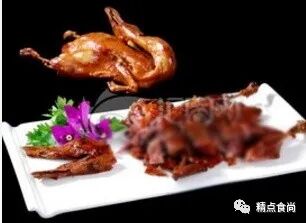 (四)童子鸡:制作方法:1、腌制:夏天5-6小时,春天12小时,冬天24小时。(在水中加盐、花椒、千里香、料酒)。2、整形:将肚皮朝上,右边的翅膀插入鸡喉,从嘴巴里拉出来,鸡爪放入肚子里面。3、出水后,直接放入调好味的卤锅中,卤制12-15分钟即可。