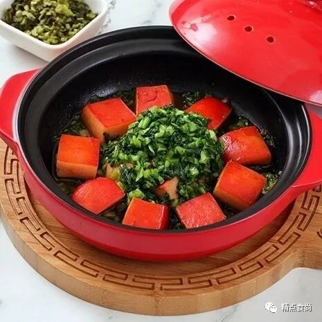 4. 起锅下少油炒香雪里红,墨鱼入砂锅雪里红放在墨鱼上,淋上煮墨鱼汁烧开即可香菜点缀。