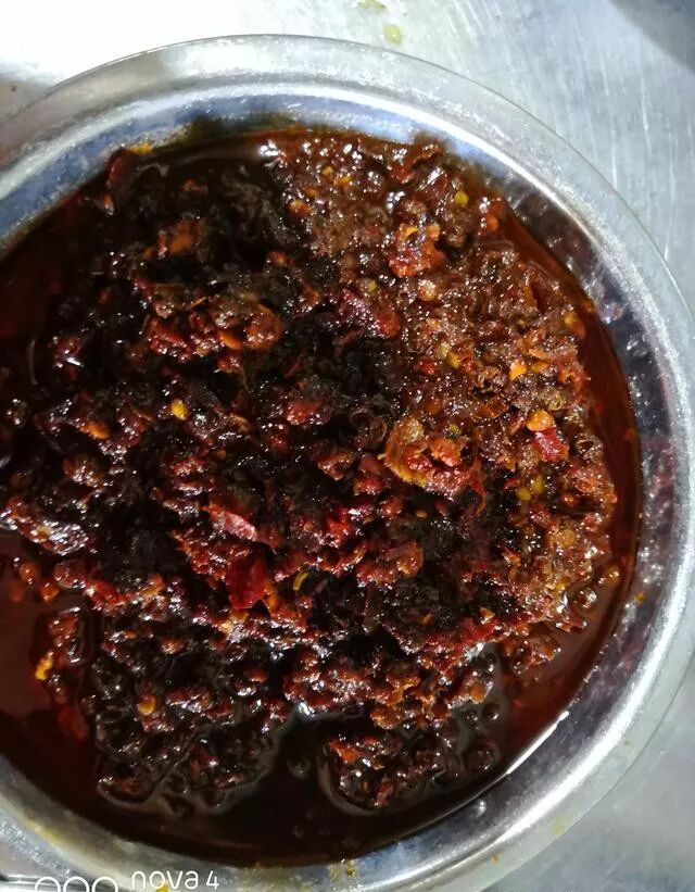 (1)干辣椒节放入锅中加清水用中火煮至皮软(用手触摸,辣椒皮很软),马上捞出,立即用清水冲洗至水色清亮,沥净水,加工成粗块,放入容器中;