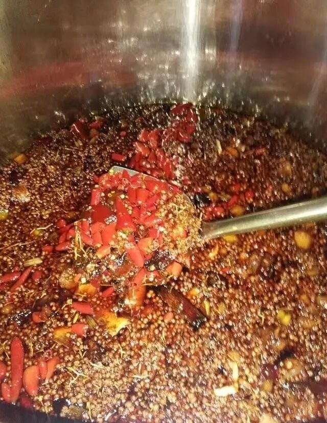 此时油温若低于120℃就不烹白酒,迅速下郫县豆瓣、豆豉,铲匀,用旺火炒至油面沸腾时,立即改用中、小火(须保持锅内三分之二油脂呈沸腾状。不能用微火),炒至豆瓣吐油时,下香料粉,,铲匀,用旺、中火,炒至油面沸腾时,立即改用中、小火(须保持锅内三分之二油脂呈沸腾状。不能用微火),炒至豆瓣瓣粒表皮紧皮、收汗、微收缩、香气浓郁时,烹入少许白酒,(慢慢下,以防溢锅,立即推匀,此时应立即测锅内油温,油温如高于120℃就应继续分多次烹入白酒,直至油温低于120℃,,铲匀(,炒至白酒水分完全蒸化时,关火,料不产生热汽时入能密封的盛器中,加盖,密封,凉透后放入能密封的盛器中,密封。炒鸡火锅底料即已制成。置放5~6日后方可使用。