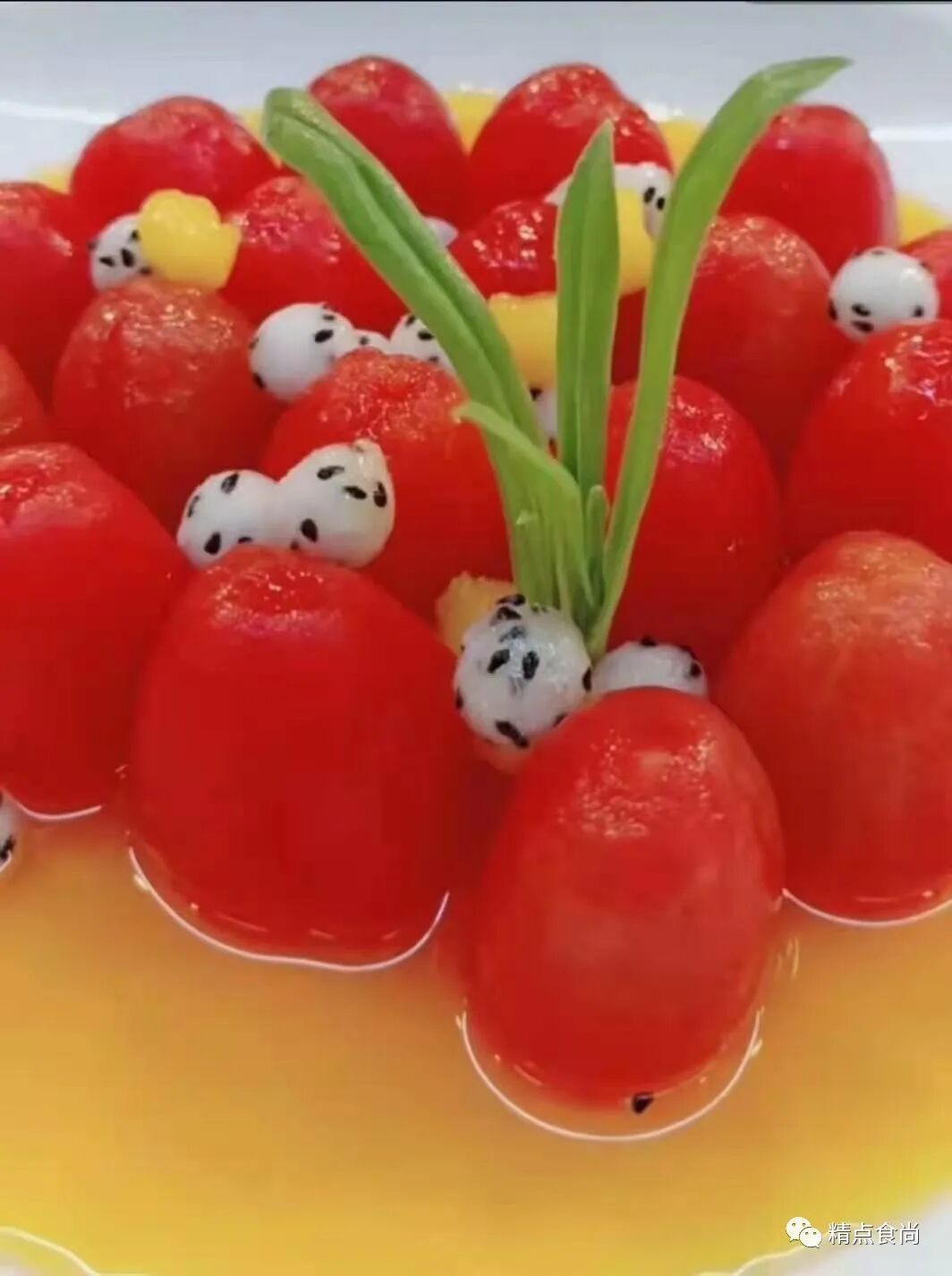4、围边装盘即可,撒上白色火龙果球和黄桃球即可。