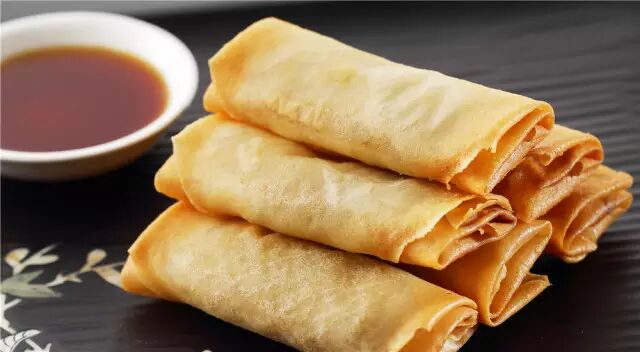 3、春卷皮摊平,将春卷馅包起呈枕头状,锅中放油烧至4成热,放入春卷炸脆捞出装盘即可。