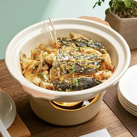 2. 将鱼头放入垫有洋葱的沙煲,均匀地淋上黄椒酱,加盖上火焖烧6分钟后,再淋上蒸鲜豉油,以及花雕酒15g,最后撒上葱花即可。