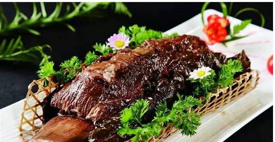此菜采用卤水的方法事先将牛肋骨卤制入味,后切块放在荷叶上蒸,最后淋上西餐特色的黑椒汁,造就了中西合璧的鲜香菜式。牛肉带着荷叶的清香,卤水香料的馨香,黑胡椒汁的辛香,口感细嫩多汁,多重的香气诱惑,让味蕾感受到前所未有的新奇滋味。