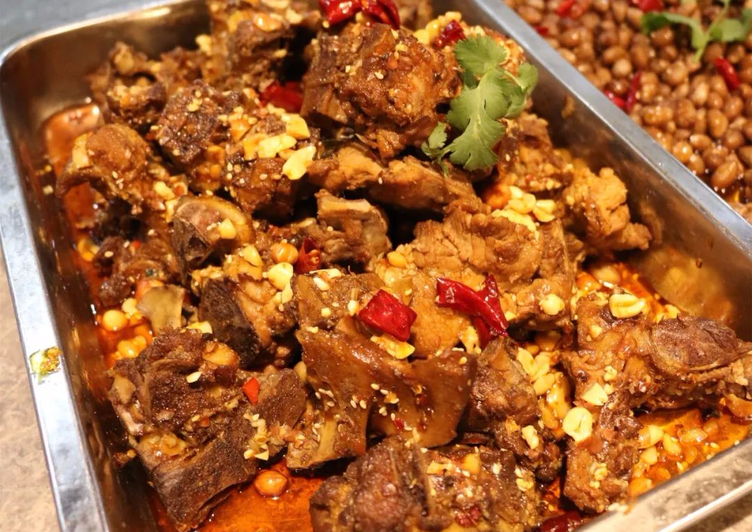 棒骨先用北方酱料腌,再入川式辣卤制熟,成菜酱香、麻辣兼备,香气扑鼻、味道浓厚。