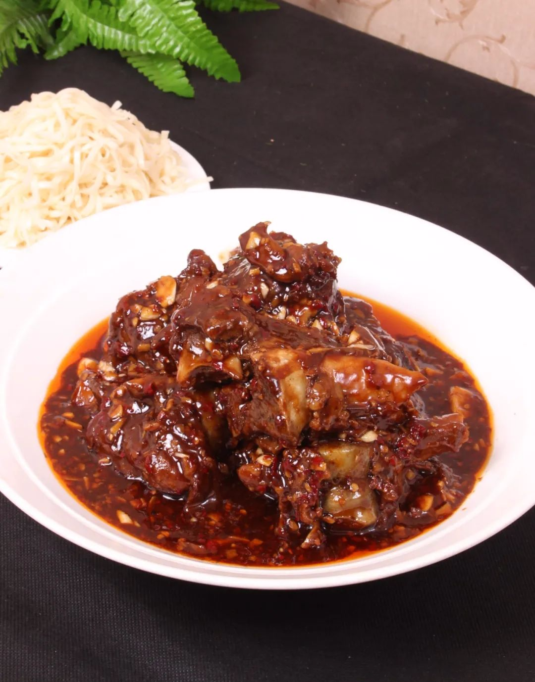 此菜创意来自酱椒鱼头,将主料换成档次较高的牛肋骨,更大气也更合时令。另外,卤牛骨的酱汤在调制时也很有新意,一是蔬菜料中添入土豆,增加酱汤的天然稠度,二是调料中加入油咖喱,使卤出的牛肉略带咖喱风味。