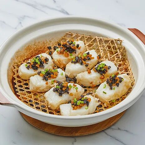 4. 沙煲放入五花肉和菜圃垫上竹网,放入石斑卷,注入开水300毫升,再放入油渣菜圃粒,加盖焗10分钟,撒上芹菜粒即可。