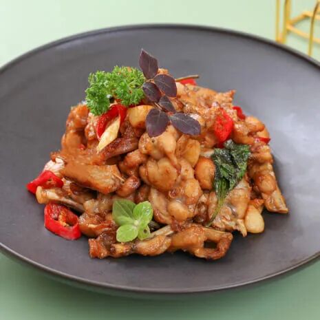 2. 起锅下猪油小料和海皇酱炒香,再下入牛蛙一起翻炒,烹入剩余调味,大火炒出镬气后,最后加入紫苏叶搅拌出香即可装盘。