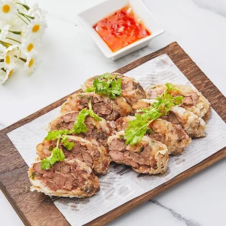 3. 猪网油洗净摊开,放入馅料80克卷成卷,入蒸箱蒸熟;