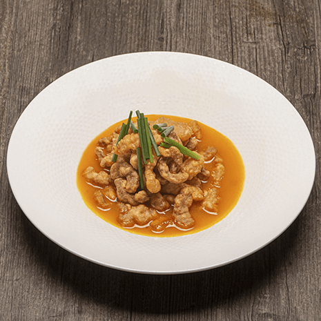3. 净锅入调味料煮开勾薄芡,酥肉摆盘,将酸汤淋入盘中即可。