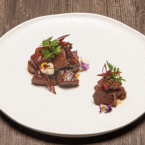 1. 将和牛改成3厘米见方块状,加入盐和黑胡椒碎腌制5分钟;