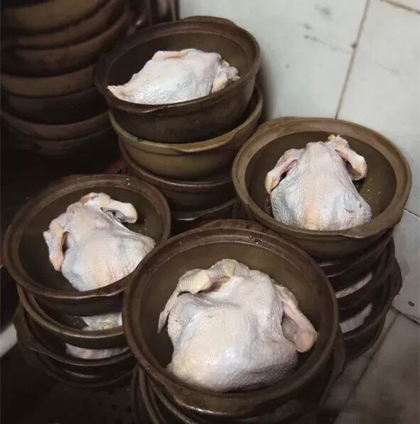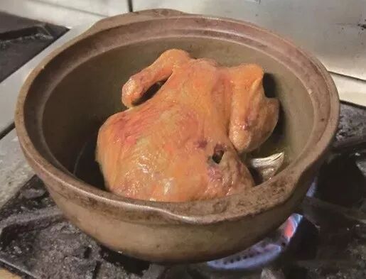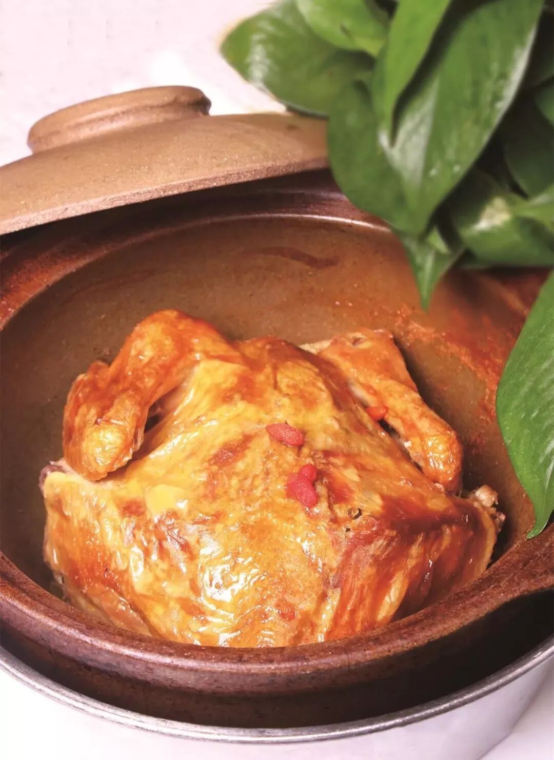 2.嫩鸡15只宰杀治净(重约900克/只),冲净后放入茶香水浸泡2小时,取出沥干水分,分装入15个砂煲,放入蒸箱大火蒸20分钟,此时鸡皮微黄,因蒸汽渗入,砂煲底部已有汤汁,取出放入烤箱,调至底火150℃、面火170℃烤40分钟,待鸡皮金黄、鸡油渗出,取出放置一旁备用。
