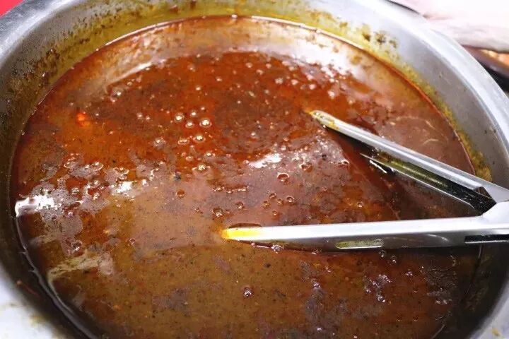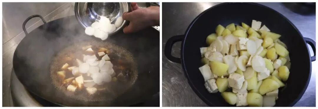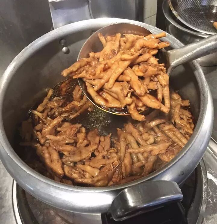 螃蟹加辣味酱料、阿胶浆烧熟,滋味浓厚;鸡爪加卤水压熟,这款卤水不仅有药香,更妙的是以无花果代替冰糖调味,甜中带有果香;土豆、豆腐、年糕三种辅料则加酱油水煮熟,其滋味相对清淡,能起到清口的作用。
