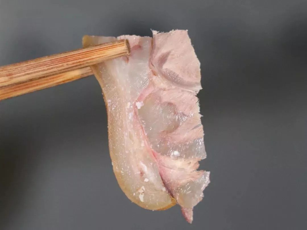 3、腌渍后肉质呈蒜瓣状分层的臭鳜鱼比较耐烧,加热10分钟口感仍然细滑紧实。