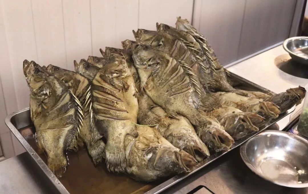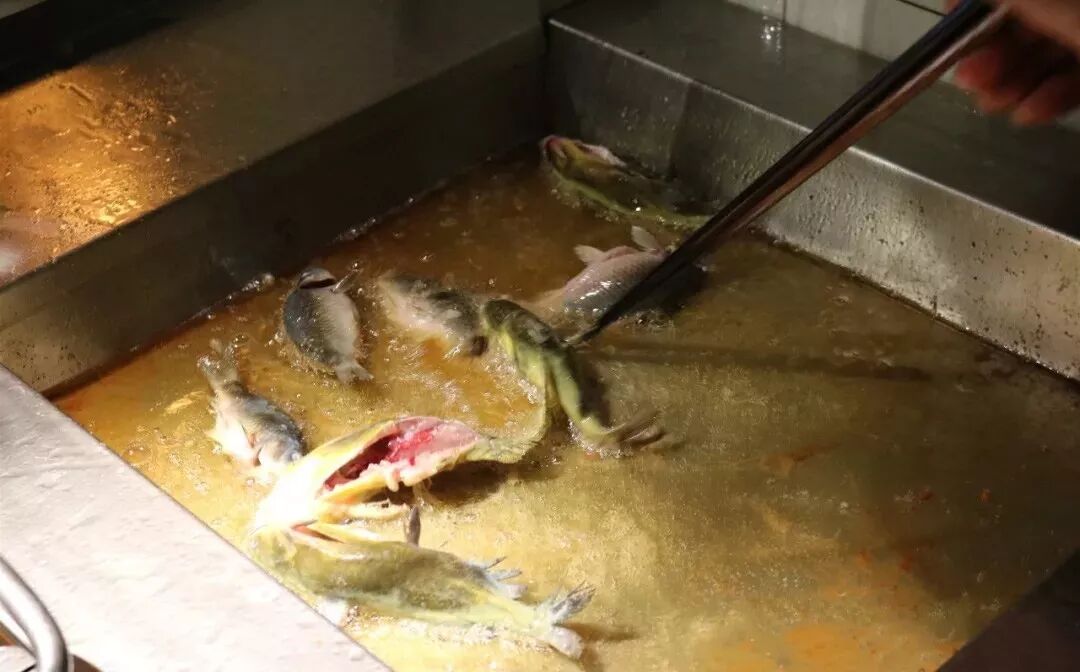 2.炸好的黄骨鱼、禾花鱼入滚水中“涮”掉表面油分。