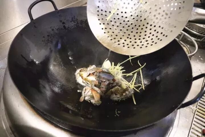 3、锅入底油烧至五成热,下入姜丝、蒜瓣各10克爆香,倒入青蟹块、蟹壳大火炒至变色,舀入鸡爪300克,添高汤1000克大火烧沸。