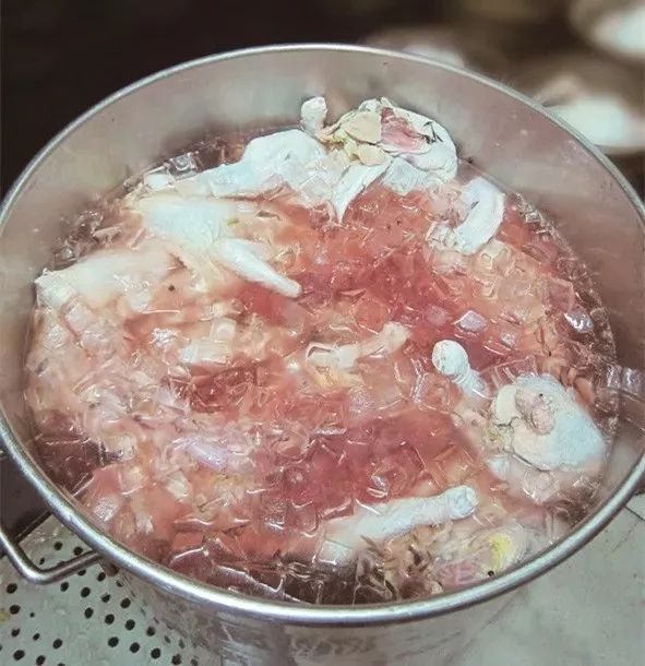 1.砍断的猪大骨、老母鸡、排骨、猪里脊、猪蹄、鸡爪分别入宽水中焯净血沫,捞出后放入不锈钢大桶,添清水,大火煮2个小时,转中火煮2个小时即可。