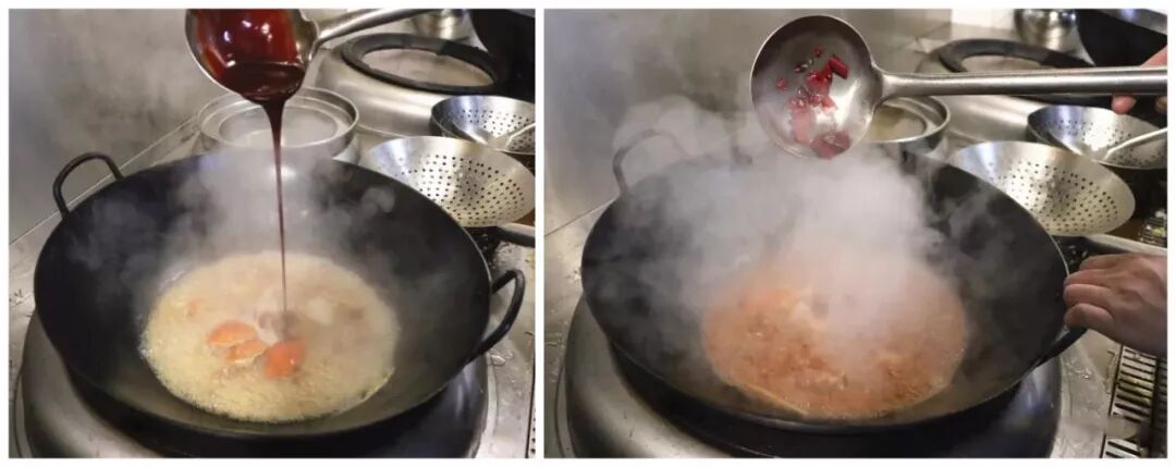 在烧制时,安徽本地的做法多是红烧或者干烧,而王师傅则结合北京客人的口味,将臭鳜鱼入菜籽油略煎去腥,然后添加用胡玉美蚕豆辣酱熬制的卤汤批量烧透,最后炒小料、添原汤勾芡浇到鱼身上,这样做不但加快了出菜速度,而且烧好的鱼鲜香滑嫩,汤汁更宽,舀汁入碗拌米饭是食客最爱的吃法。