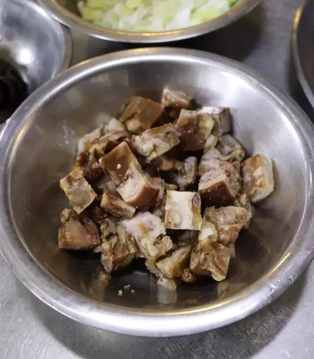 1.按客人点菜分量抓取牛肉片以及牛筋片、牛肚片等(煮制方法同“批量预制”)。
