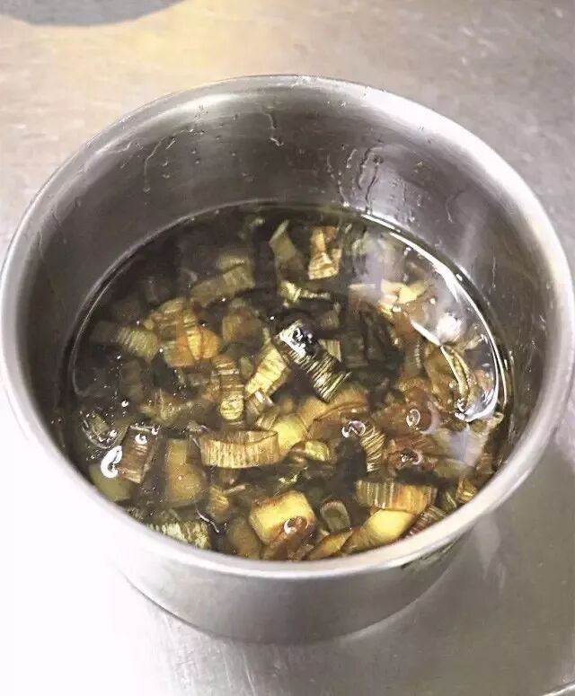锅入色拉油3000克,下入八角2个、香叶10克炸香,放大葱片2500克不停煸炒至变软、出香,待大葱缩水、变糊,连油带料一同放入不锈钢盆即成。
