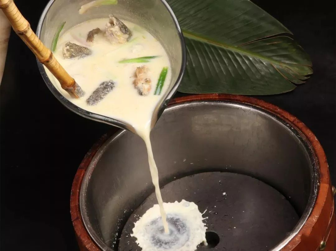 3.净锅置于火上,取提前熬好的豆浆鱼汤1200克滤渣后倒入锅内,放入炸好的黄骨鱼3条、禾花鱼3条,下白贝6个、小河虾6个、鱼丸5个,大火烧开后转中火煮约2分钟,调入盐10克、味粉3克,起锅倒入塑料量杯中,撒少许香葱段,带底部装有火山石(火山石放入温度为240℃的烤箱中烤约1小时)的木桶走菜。上桌后,由服务员将量杯中的原料和汤汁倒入木桶即成。