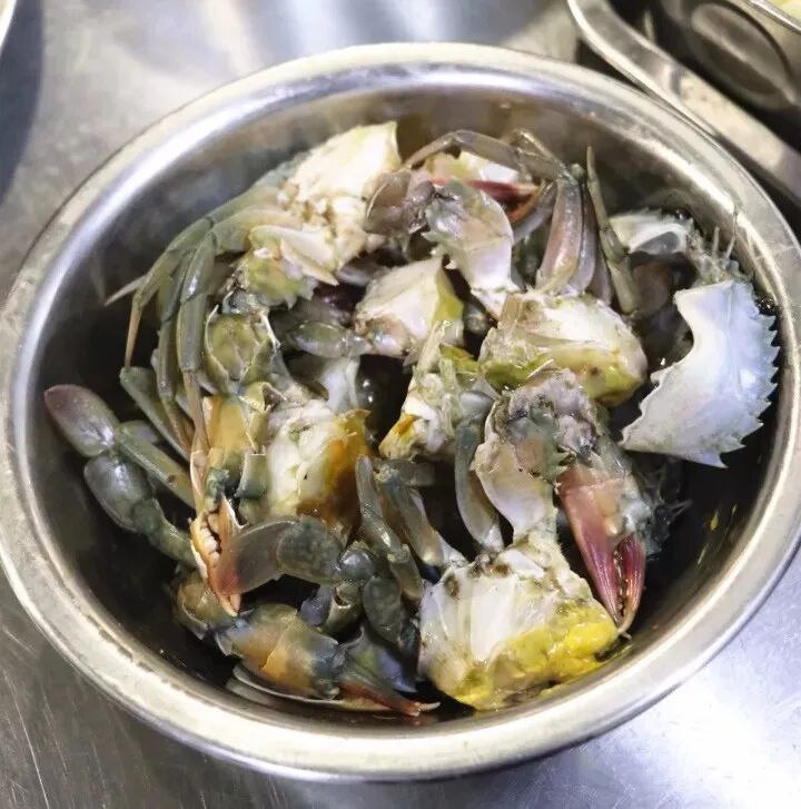 1、青蟹(重约180克/只)去壳治净,将蟹身一切为四,加料酒、葱姜水抓匀去腥。