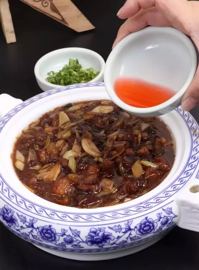 3、炒锅滑透,离火下入大葱片40克,将锅重置火上,淋少许葱油煸至出香,倒入炸好的猪蹄,在锅边烹入料酒30克,释放锅气的同时也能带走猪蹄的部分腥味,调入东古酱油15克,烹入陈醋20克,然后倒入清鸡汤100克,加适量盐、鸡粉、白胡椒粉补味,点入老抽3克,勾薄芡,加葱油中的糊葱片80克翻匀,出锅盛入垫有木耳的盘中,带香菜、大红浙醋各一小碟即可走菜。