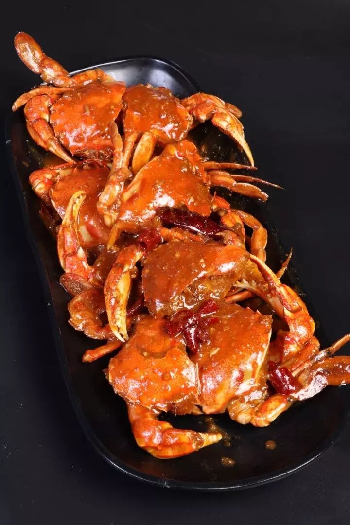 2、锅入底油烧至五成热,下入干辣椒段5克炸香,放自制焗香酱40克炒香,加高汤30克搅匀,下入螃蟹小火焗1分钟,起锅装盘即成。
